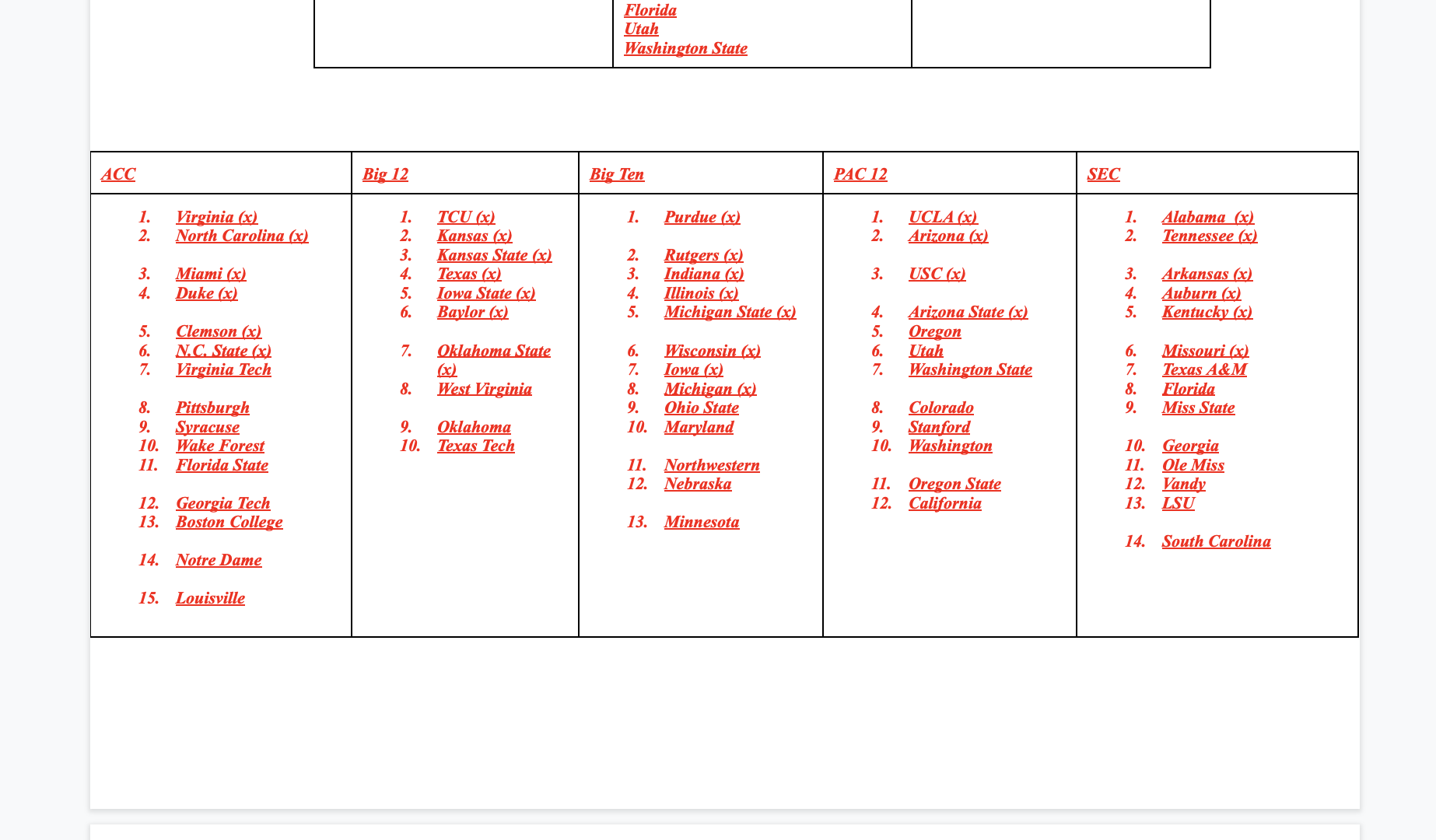 Here is the link to my live dashboard where I constantly update conference power rankings and map the tournament field